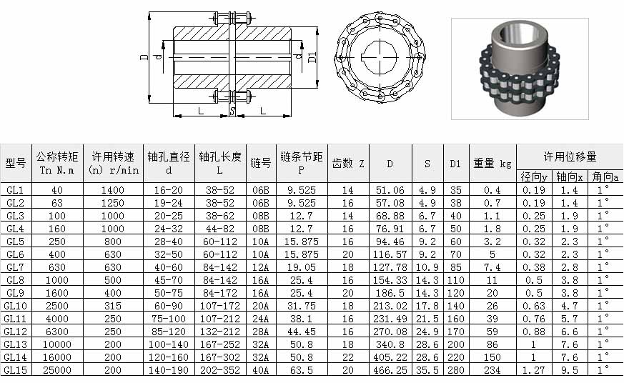 滾子鏈聯(lián)軸器規(guī)格尺寸表: